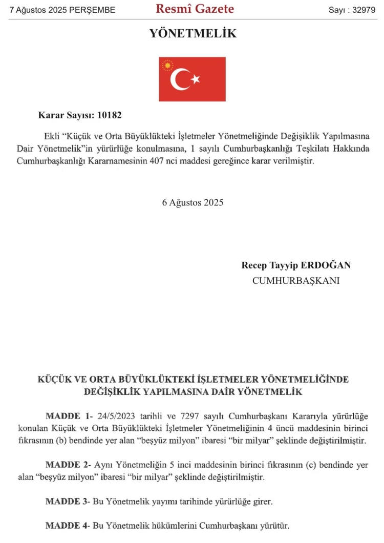 Yeni düzenlemeyle, KOBİ tanımında yer alan mali kriterler güncellendi. Buna göre, yıllık 250 kişiden az çalışanı olan ve yıllık net satış hasılatı veya mali bilançosundan herhangi biri 1 milyar TL’yi aşmayan işletmeler KOBİ olarak sınıflandırılacak.