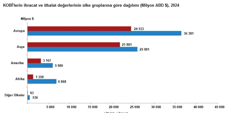 KOBİ’ler, 2024 yılında toplam ihracatın yüzde 29,6’sını, ithalatın ise yüzde 15,9’unu gerçekleştirdi. İhracatta mikro girişimler yüzde 2,4, küçük girişimler yüzde 10,7, orta ölçekli girişimler yüzde 16,5 pay alırken, KOBİ ihracatının yüzde 59,4’ü ticaret, yüzde 34,3’ü imalat sanayi ürünlerinden oluştu. İthalatta ise KOBİ’lerin payı yüzde 65,6 ticaret, yüzde 25,8 sanayi olarak belirlendi.