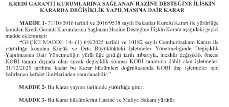 Daha önce KOBİ tanımı dışında olan ancak yeni düzenlemeyle KOBİ kapsamına giren işletmeler, 31 Aralık 2025 tarihine kadar KOBİ dışı işletmeler için belirlenen kefalet limitlerinden yararlanabilecek.