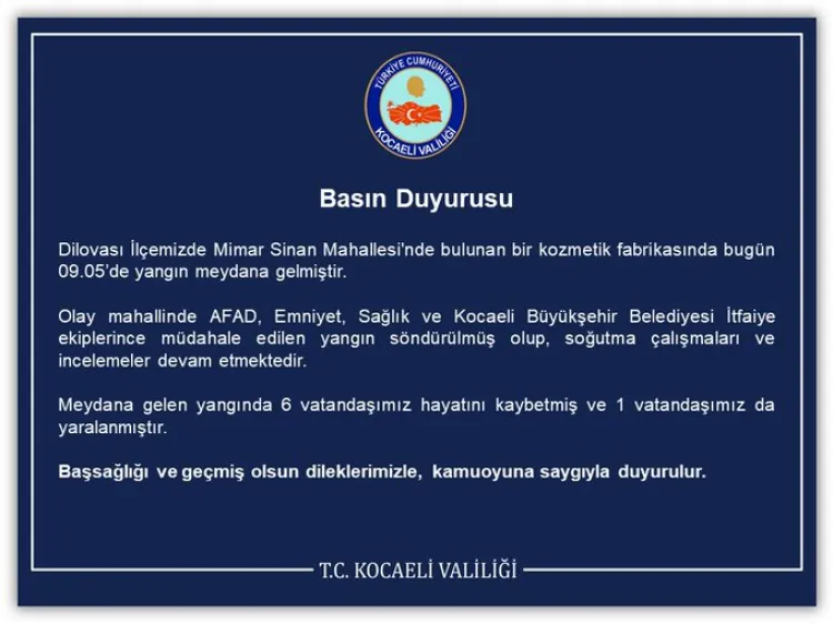 Kocaeli Valiliği tarafından yapılan açıklamada, yangında 6 kişinin hayatını kaybettiği, 1 kişinin ise yaralandığı bildirildi. Valilik açıklamasında, “Başsağlığı ve geçmiş olsun dileklerimizle, kamuoyuna saygıyla duyurulur” denildi.