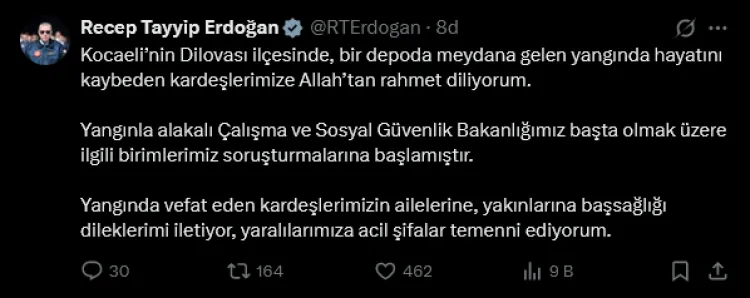 Cumhurbaşkanı Recep Tayyip Erdoğan da sosyal medya hesabından yaptığı paylaşımda, hayatını kaybedenler için Allah’tan rahmet dileyerek, yaralılara acil şifalar temenni etti. Erdoğan, “Yangınla alakalı Çalışma ve Sosyal Güvenlik Bakanlığımız başta olmak üzere ilgili birimlerimiz soruşturmalarına başlamıştır. Yangında vefat eden kardeşlerimizin ailelerine, yakınlarına başsağlığı dileklerimi iletiyorum” ifadelerini kullandı.