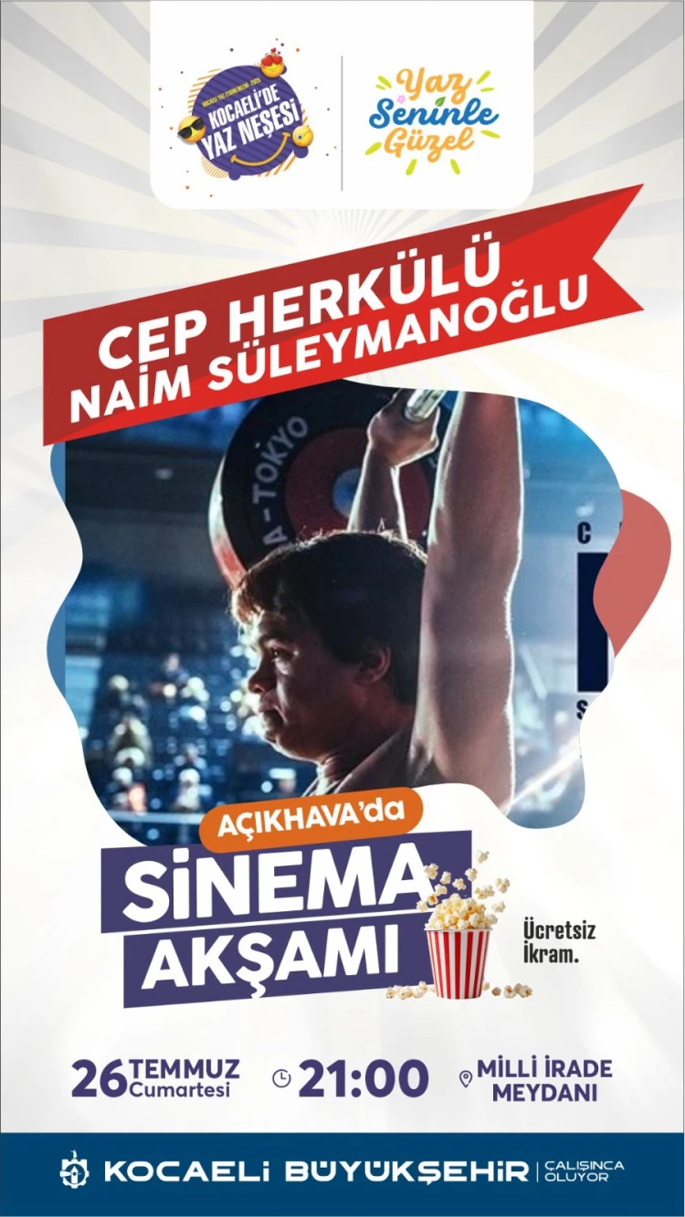 KOCAELİ (İGFA) - Koceli Büyükşehir Belediyesi, “Açık Havada Sinema Keyfi” ile yaz akşamlarına renk katacak. İzmit Milli İrade Meydanı’nda gerçekleştirilecek yerli sinema gösterimleri Cumartesi günü saat 21.00’de “Cep Herkülü Naim Süleymanoğlu” ile başlayacak.