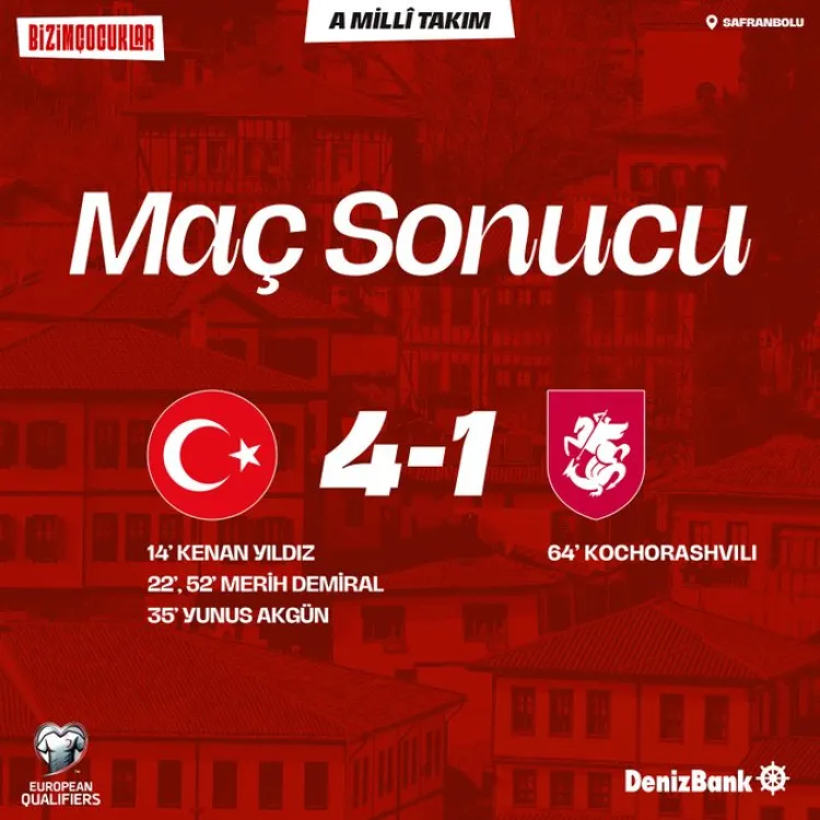 Kocaeli’de oynanan maçta A Millî Futbol Takımımız, rakibini mağlup ederek büyük bir zafer elde etti. FIFA 2026 Dünya Kupası Avrupa Elemeleri E Grubu 4’üncü maçında Gürcistan’ı 4-1 mağlup ederek , puanını 9'a yükseltti.