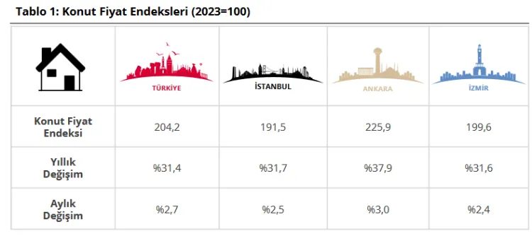 Merkez Bankası verilerine göre, Türkiye genelinde konut fiyatları Kasım 2025’te bir önceki aya göre yüzde 2,7 yükselirken, yıllık artış nominal olarak yüzde 31,4, reel olarak ise yüzde 0,3 oldu.