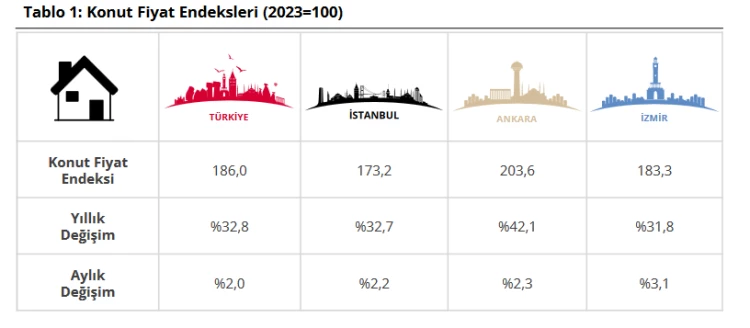 İstanbul, Ankara ve İzmir’deki konut fiyat endeksleri de değerlendirildi. Haziran 2025’te bir önceki aya göre İstanbul’da yüzde 2,2, Ankara’da yüzde 2,3 ve İzmir’de yüzde 3,1 artış kaydedildi. Yıllık bazda ise İstanbul’da yüzde 32,7, Ankara’da yüzde 42,1 ve İzmir’de yüzde 31,8 oranında artış gözlendi.