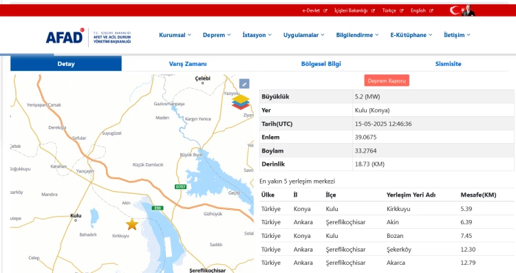 ANKARA (İGFA) - AFAD'dan alınan bilgiye göre, merkez üssü Konya'nın Kulu ilçesinde saat 15.46'da, 5,2 büyüklüğünde bir deprem meydana geldi.