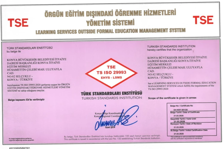 Konya Büyükşehir İtfaiyesi, “TSE ISO 29993 Örgün Eğitim Dışındaki Öğrenme Hizmetleri Yönetim Sistemi Sertifikası”na layık görüldü.