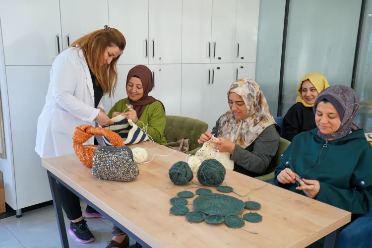 Panç, rölyef, supla ve çanta örümü gibi atölyelerde el becerilerini geliştiren anneler, aynı zamanda sosyalleşiyor, moral buluyor ve psikolojik destek sağlıyor.