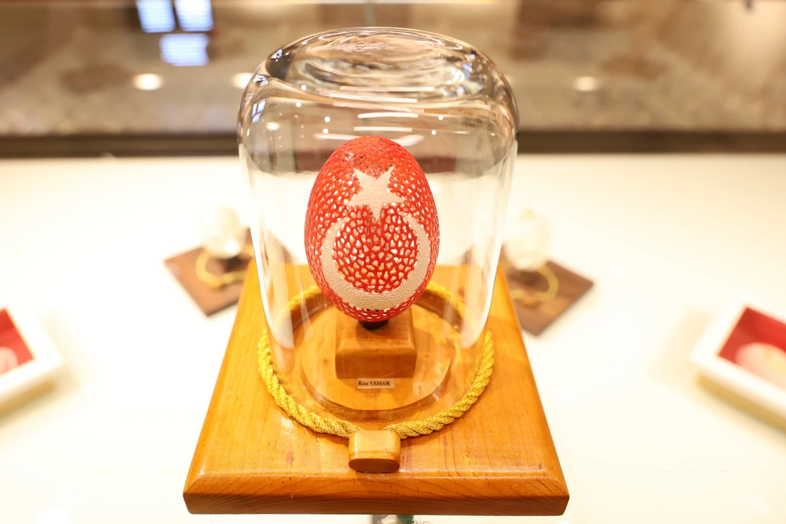 Ahşap ve yumurta kabuğu oyma sanatçısı, Kültür ve Turizm Bakanlığı Somut Olmayan Kültürel Miras Taşıyıcısı Rıza Yaman ile Nahhat Abdullah Şanlı’nın zarif eserlerinden oluşan sergide; sedef kakma, gümüş kakma, ahşap oyma ve yumurta kabuğu oyma sanatının en seçkin örnekleri yer alıyor.