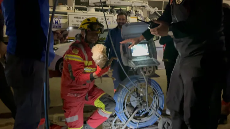 Konya Büyükşehir Belediyesi İtfaiye Dairesi Başkanlığı ve KOSKİ Genel Müdürlüğü ekipleri, kanalizasyon borusuna düşerek mahsur kalan minik köpeği 6 saat süren titiz bir çalışmanın ardından kurtardı.
