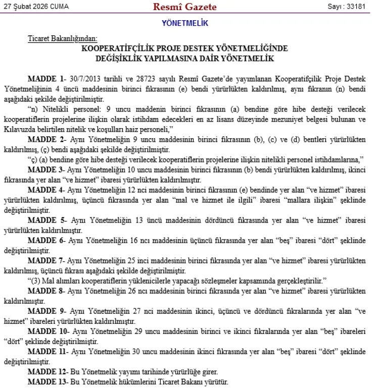 Ticaret Bakanlığı’nın Kooperatifçilik Proje Destek Yönetmeliği’nde yaptığı değişiklikler Resmi Gazete’de yayımlanarak yürürlüğe girdi. Düzenlemeyle “hizmet” ibareleri birçok maddeden çıkarılırken, nitelikli personel istihdamına ilişkin hükümler yeniden düzenlendi ve bazı süreler 5 yıldan 4 yıla indirildi.