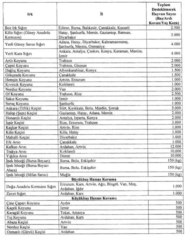 Koruma kapsamında şu illerde ırk ve sayıda hayvan/arılı kovan/kg yaş koza için destekleme ödemesi yapılacağı belirtildi.