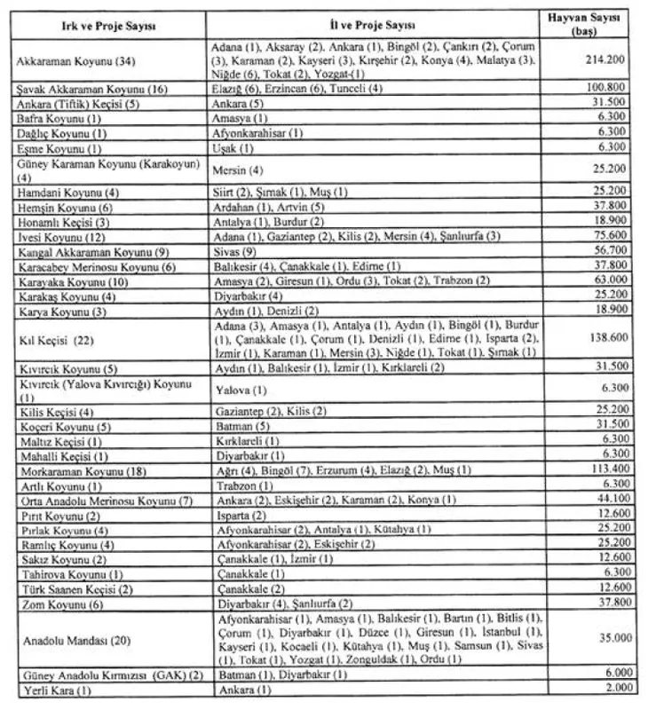 Hayvan genetik kaynaklarının yerinde geliştirilmesine (Halk Elinde Küçükbaş, Yerli Sığır ve Anadolu Mandası Islahı Projesi) ilişkin desteklemelere dair usul ve esaslar kapsamında; yeni başlatılacak alt projeler ile önceki yıllarda başlatılan ve devam edecek alt projeler şöyle: