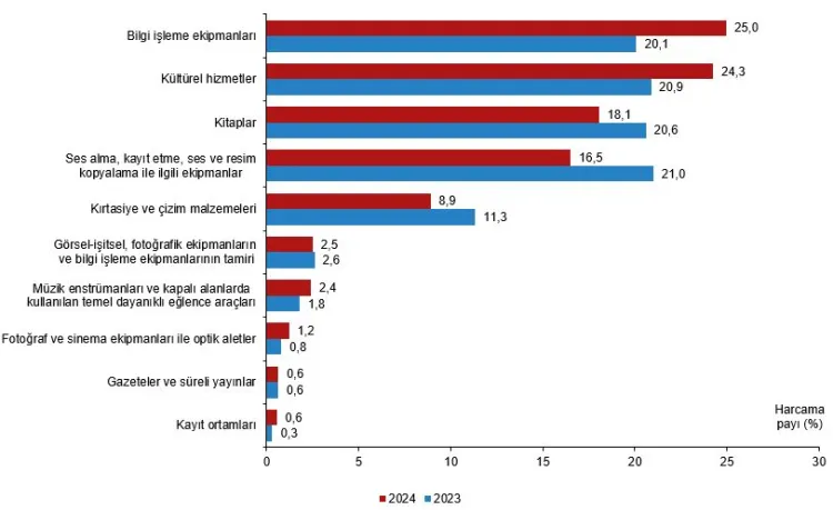 Hanehalkı harcamalarının dağılımında; bilgi işleme ekipmanları (yüzde 25,0), kültürel hizmetler (yüzde 24,3), kitaplar (yüzde 18,1) başı çekti.
