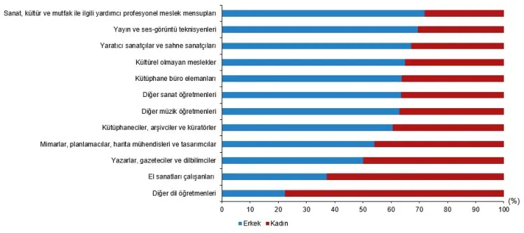 Meslek grubu dağılımında el sanatları çalışanları yüzde 32,6 ile birinci sırada yer alırken, kadın istihdamının en yüksek olduğu alan diğer dil öğretmenleri (yüzde 77,7) oldu. En düşük olduğu alan ise sanat, kültür ve mutfakla ilgili yardımcı meslekler (yüzde 28,2) oldu.