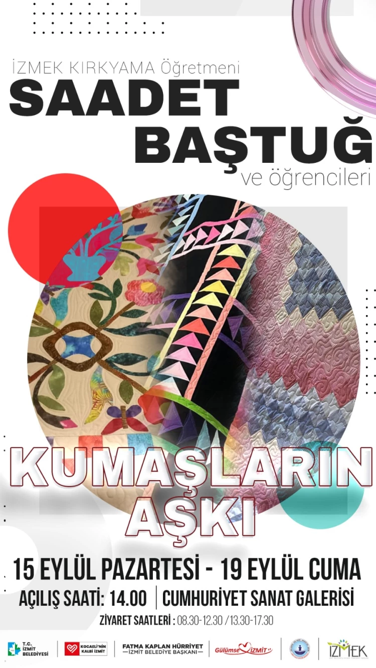 İZMEK Öğretmenlerinden Saadet Baştuğ’un öğrencileriyle birlikte hazırladığı ‘Kumaşların Aşkı ‘sergisi, 15 Eylül Pazartesi günü Cumhuriyet Sanat Galerisi’nde açılıyor
