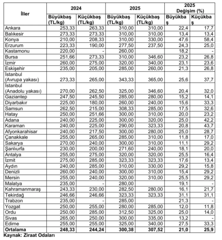 Küçükbaş: Hayvan başına 13 bin TL ile 40 bin TL, canlı kilogram fiyatı 230 TL-380 TL (ortalama 307,52 TL).