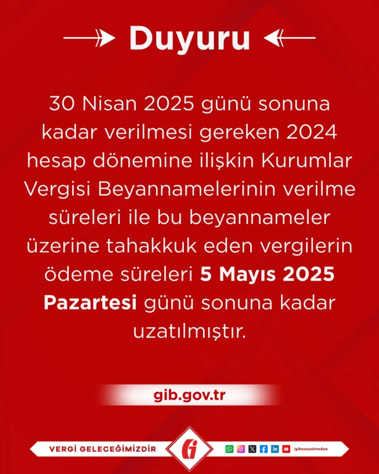 Gelir İdaresi Başkanlığı (GİB), 2024 yılı hesap dönemine ait Kurumlar Vergisi beyannamelerinin verilme ve ödeme süreleri ile e-Defter ve berat dosyalarının oluşturulma, imzalanma ve yüklenme sürelerini uzattı.