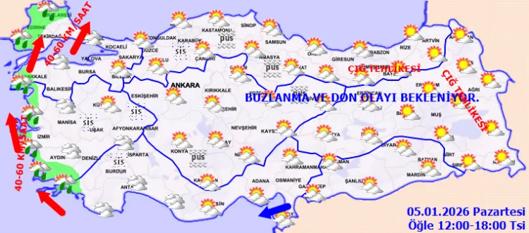 Sabah ve gece saatlerinde iç ve doğu bölgelerde buzlanma ve don ile birlikte pus ve yer yer sis olayı bekleniyor. Doğu Karadeniz’in iç kesimlerinin yüksekleri ile Doğu Anadolu’nun doğusunda yüksek kar örtüsüne sahip eğimli kesimlerinde çığ tehlikesi bulunmaktadır.