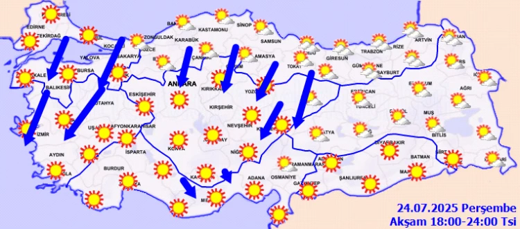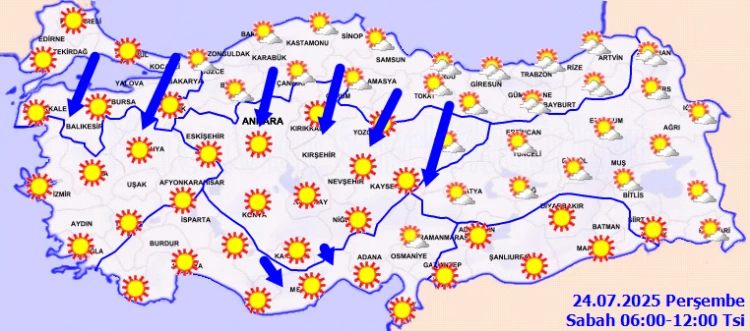 BURSA (İGFA) - Meteoroloji Genel Müdürlüğü, 24 Temmuz Perşembe gününe ilişkin hava tahmin raporunu yayımladı. Yapılan tahminlere göre Türkiye'nin kuzeydoğu kesimlerinin parçalı yer yer çok bulutlu, Giresun, Trabzon, Rize ve Artvin illerinin iç kesimleri ile Ağrı'nın güney ve doğusu ve Van'ın doğusu yerel sağanak yağışlı, diğer yerlerin az bulutlu ve açık geçeceği tahmin edildi.