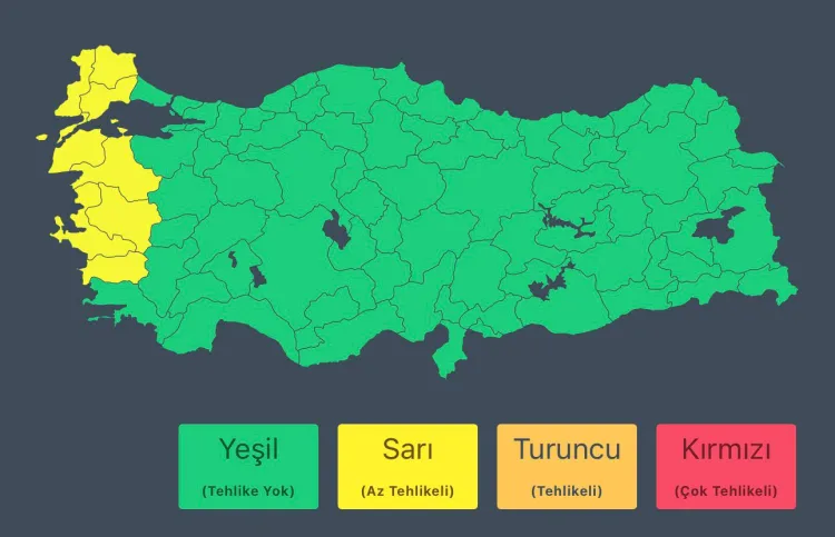 İçişleri Bakanlığı, vatandaşlara yaptığı uyarıda ani sel, su baskını, yıldırım, kuvvetli rüzgâr ve ulaşımda aksamalar gibi olumsuzluklara karşı dikkatli ve tedbirli olunması gerektiğini vurguladı. Yetkili mercilerin uyarılarının yakından takip edilmesi istendi.