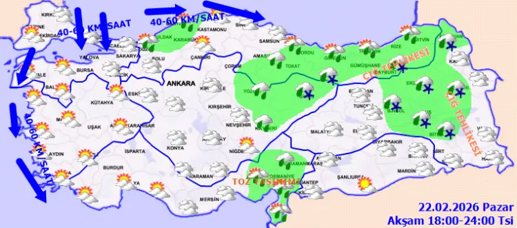 BURSA (İGFA) - Meteoroloji Genel Müdürlüğü 22 Şubat Pazar gününe ilişkin hava tahmin raporunu yayımladı. Yapılan son değerlendirmelere göre; Marmara, Ege (Manisa hariç), Akdeniz, İç Anadolu, Karadeniz, Doğu Anadolu’nun kuzeybatısı ile Ardahan, Ağrı, Bitlis, Şırnak, Hakkâri, Muş, Gaziantep, Siirt çevreleri ve Van’ın kuzey ilçelerinde yağış bekleniyor.