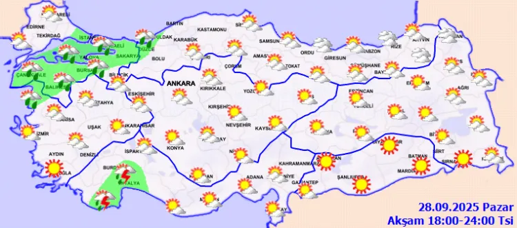 ANKARA (İGFA) - Meteoroloji Genel Müdürlüğü, 28 Eylül 2025 tarihli hava tahmin raporunu yayımladı. Rapora göre, yurdun kuzeybatı kesimlerinde parçalı ve yer yer çok bulutlu bir hava bekleniyor.