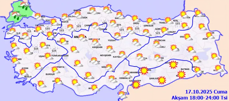 ANKARA (İGFA) - Meteoroloji Genel Müdürlüğü, haftanın son iş günü 17 Ekim Cuma gününe ilişkin hava tahmin raporunu yayımladı.