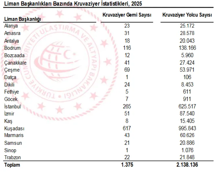 Limanlara uğrayan kruvaziyer gemi sayısı yüzde 15,1, yolcu sayısı ise yüzde 13,2 artarak 2 milyon 138 bin 136 oldu. En fazla kruvaziyer uğrağı Kuşadası Limanı’nda gerçekleşti.