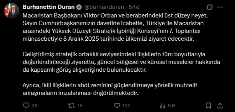 ANKARA (İGFA) - İletişim Başkanı Burhanettin Duran, Macaristan Başbakanı Viktor Orban’ın Cumhurbaşkanı Recep Tayyip Erdoğan’ın daveti üzerine 8 Aralık Pazartesi günü Türkiye’yi ziyaret edeceğini duyurdu. Orban’a, Macaristan hükümetinden üst düzey bir heyet de eşlik edecek.