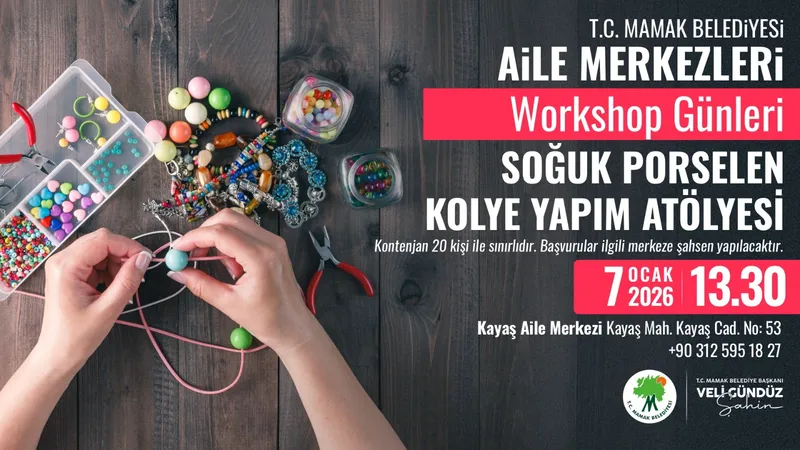 Aynı gün gerçekleştirilecek ikinci etkinlik ise Kayış Aile Merkezinde yapılacak “Soğuk Porselen Kolye Yapım Atölyesi” olacak. Saat 13.30’da başlayacak atölyede katılımcılar, soğuk porselen tekniğiyle kendi özgün kolyelerini tasarlama imkânı bulacak. Kontenjanı 20 kişi ile sınırlı olan çalışma için başvurular şahsen alınacak.