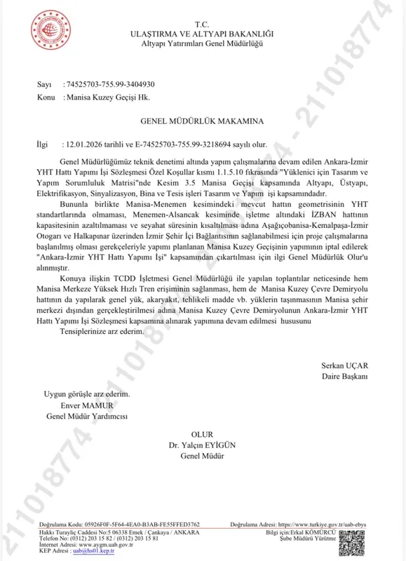 AK Parti Manisa Milletvekili Murat Baybatur, Ankara–İzmir Yüksek Hızlı Tren Projesi’nin Manisa’dan geçeceğinin netleştiğini açıkladı. Baybatur, Manisa Kuzey Çevre Demiryolu Projesi’nin ise ayrı bir hat olarak planlanacağını duyurdu.