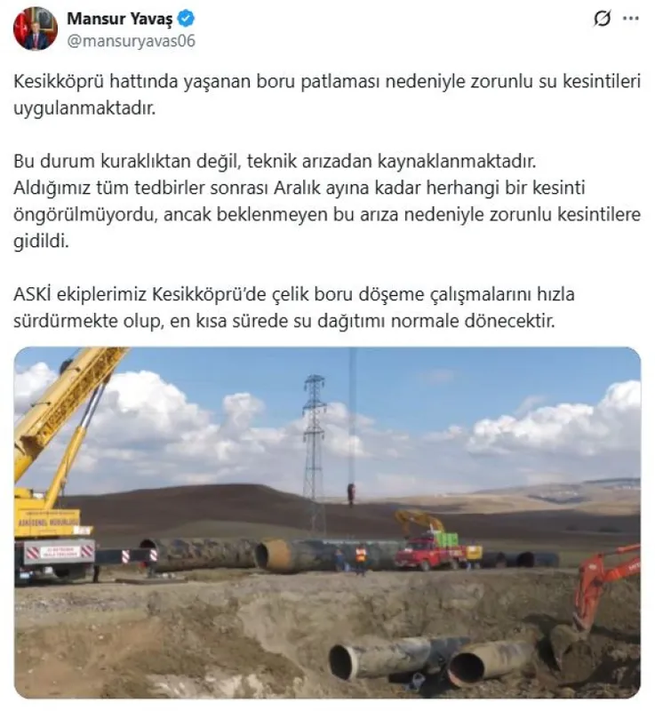 Sosyal medya üzerinden de konuya ilişkin açıklama yapan Mansur Yavaş, “Kesikköprü hattında yaşanan boru patlaması nedeniyle zorunlu su kesintileri uygulanmaktadır. Bu durum kuraklıktan değil, teknik arızadan kaynaklanmaktadır. Aldığımız tüm tedbirler sonrası aralık ayına kadar herhangi bir kesinti öngörülmüyordu, ancak beklenmeyen bu arıza nedeniyle zorunlu kesintilere gidildi. ASKİ ekiplerimiz Kesikköprü’de çelik boru döşeme çalışmalarını hızla sürdürmekte olup en kısa sürede su dağıtımı normale dönecektir” ifadelerini kullandı.