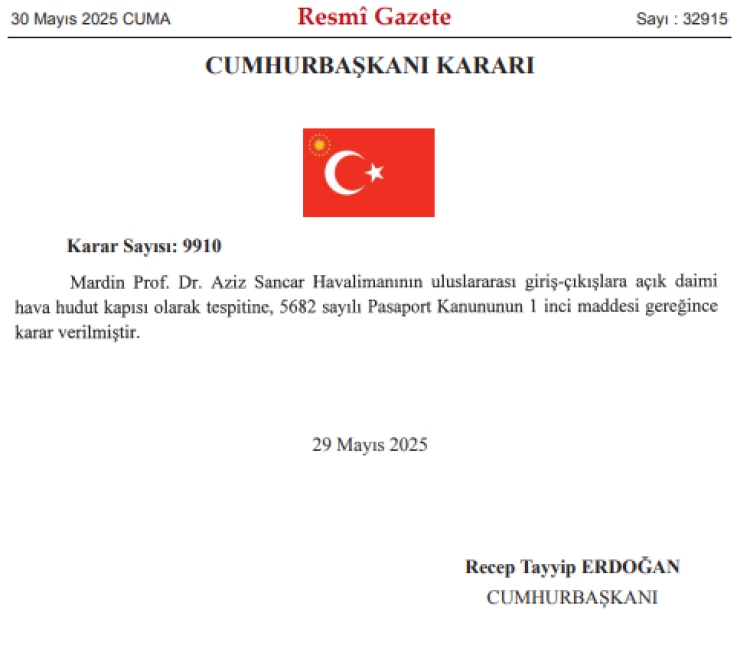 Mardin Prof. Dr. Aziz Sancar Havalimanı, Cumhurbaşkanı Kararı ile uluslararası giriş-çıkışlara açık daimi hava hudut kapısı olarak belirlendi. Resmi Gazete’de yayımlanan karar, Mardin’in küresel ulaşım ağındaki rolünü güçlendirecek.