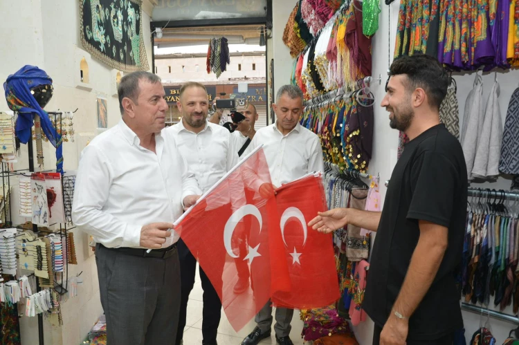 Başkan Şahin, AK Parti İlçe Başkanı Atilla Yarış ile birlikte esnaf ziyaretleri gerçekleştirerek, dükkanlara Türk bayrağı hediye etti. Bayrakları iş yerlerine asan esnaflar, teröre karşı birlik mesajı verdi.