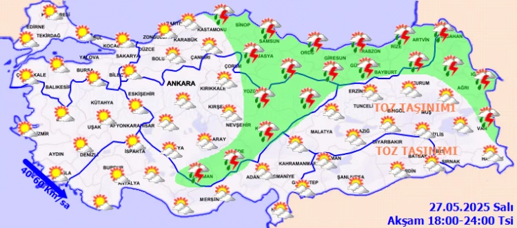 Meteoroloji; Akdeniz, İç Anadolu, Orta ve Doğu Karadeniz ile Doğu ve Güneydoğu Anadolu'da toz taşınımı beklendiğinden yaşanabilecek olumsuzluklara karşı dikkatli ve tedbirli olunması isterken, Batı Karadeniz'in doğusu ile Yozgat, Çankırı ve Çorum çevrelerini 'kuvvetli yağış' noktasında uyardı.