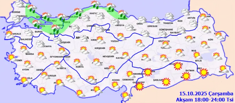 Meteoroloji Genel Müdürlüğü'nün son tahminlerine göre, Marmara’nın doğusu, Batı Karadeniz ve Samsun çevrelerinde sağanak yağış beklenirken, diğer bölgelerde hava az bulutlu ve açık geçecek.