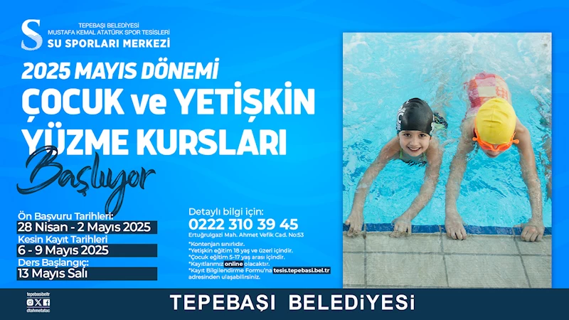 Tepebaşı Belediyesi Mustafa Kemal Atatürk Spor Tesisleri Su Sporları Merkezi’nde düzenlenecek olan 2025 Mayıs dönemi yetişkin, çocuk yüzme eğitimleri ve kurslar için başvurular başladı.