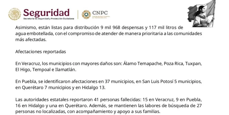 Eyalet yetkilileri, Veracruz'da 15, Puebla'da 9, Hidalgo'da 16 ve Querétaro'da bir olmak üzere 41 kişinin hayatını kaybettiğini bildirdi. Ayrıca, kayıp 27 kişiyi arama çalışmaları devam ediyor.