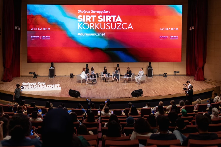 Acıbadem Üniversitesi’nde düzenlenen “Skolyoz Savaşçıları Sırt Sırta, Korkusuzca” etkinliğinde, genç şarkıcı Melis Fis skolyoz hikayesini paylaşırken, Prof. Dr. Ahmet Alanay erken tanının önemini vurguladı.