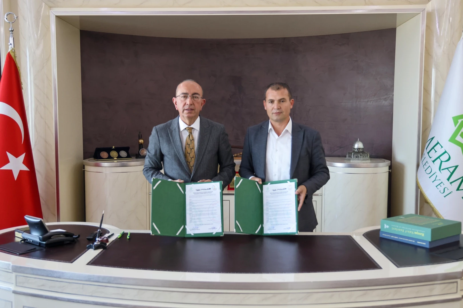 KONYA (İGFA) - Konya Meram Belediyesi ile Afyonkarahisar’ın Nuribey Belediyesini kardeş yapan protokol Meram Belediye Başkanı Mustafa Kavuş ile Nuribey Belediye Başkanı Halil Kaya tarafından atıldı. İmzalarla resmiyet kazanan protokol, iki ilçe arasında dostluk, iş birliği ve kültürel dayanışmanın önünü açacak. Kendisi de Nuribeyli olan Mülkiye Müfettişi Mehmet Demiral da protokolün imza töreninde belediye başkanlarını yalnız bırakmadı.