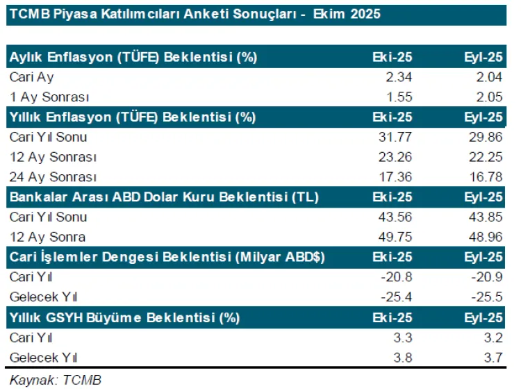 ANKARA (İGFA) - Türkiye Cumhuriyet Merkez Bankası (TCMB), Ekim 2025 Piyasa Katılımcıları Anketi sonuçlarını açıkladı.