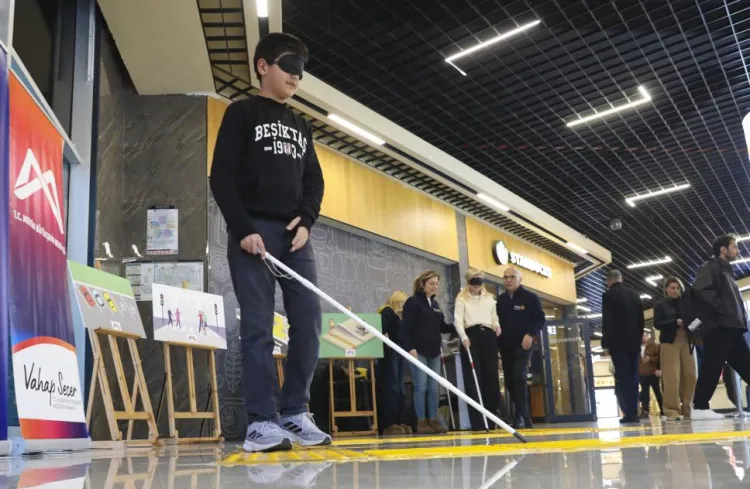 MERSİN (İGFA) -Etkinlik kapsamında kurulan farkındalık parkurunda vatandaşlar göz bandı takarak, beyaz baston eşliğinde hissedilebilir yüzey üzerinde yürüdü. Katılımcılar, görme engelli bireylerin günlük hayatta yaşadığı zorlukları deneyimleyerek empati kurma fırsatı buldu.