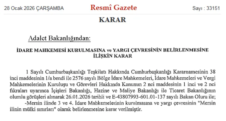 ANKARA (İGFA) - Adalet Bakanlığı tarafından hazırlanan “İdare Mahkemesi Kurulmasına ve Yargı Çevresinin Belirlenmesine İlişkin Karar”, bugünkü Resmi Gazete’de yayımlandı. Buna göre Mersin ilinde 3. ve 4. İdare Mahkemelerinin kurulmasına karar verildi.