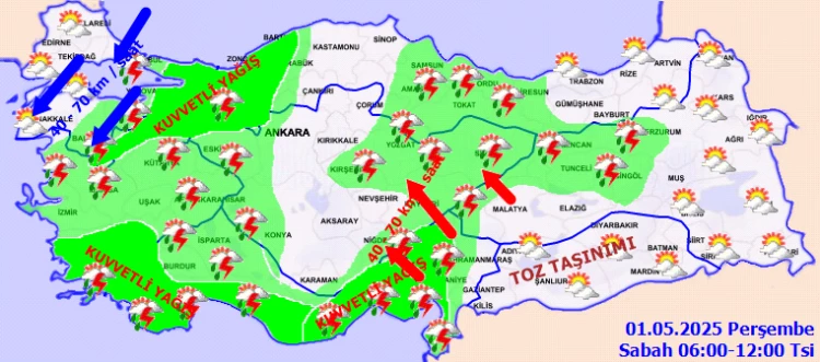 Yağışların; Güney Ege, Akdeniz, İç Anadolu’nun kuzeybatısı, Batı Karadeniz’in batısı ile Kocaeli, Sakarya, Bilecik, Kütahya, Uşak, Sivas, Tokat çevreleri, Bursa ve Balıkesir'in güney kesimleri, Kayseri'nin güney ve doğusunda yerel olmak üzere kuvvetli olması beklendiğinden yaşanabilecek olumsuzluklara karşı dikkatli ve tedbirli olunması gerekmektedir.