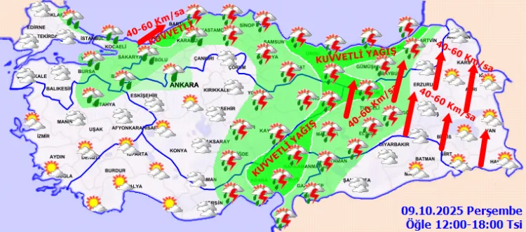 Meteoroloji, Türkiye genelinde parçalı ve çok bulutlu bir hava, belirli bölgelerde sağanak ve gök gürültülü sağanak yağış bekliyor. Doğu Akdeniz, Doğu Karadeniz gibi bölgelerde yağışlar kuvvetli olacak. Rüzgar, bazı bölgelerde 40-60 km/saat hızla esecek.