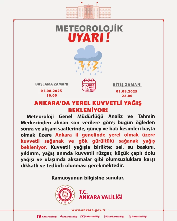 Bu arada etkisini saat 22.00'ye kadar sürdürmesi beklenen yerel kuvvetli yağışa karşı Ankara Valiliği'nden ayrı bir uyarı yayımlandı.