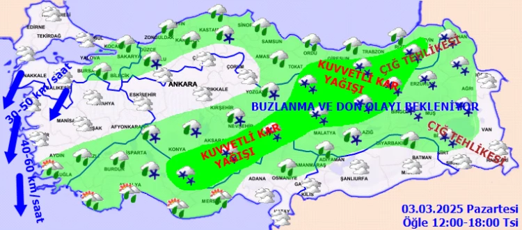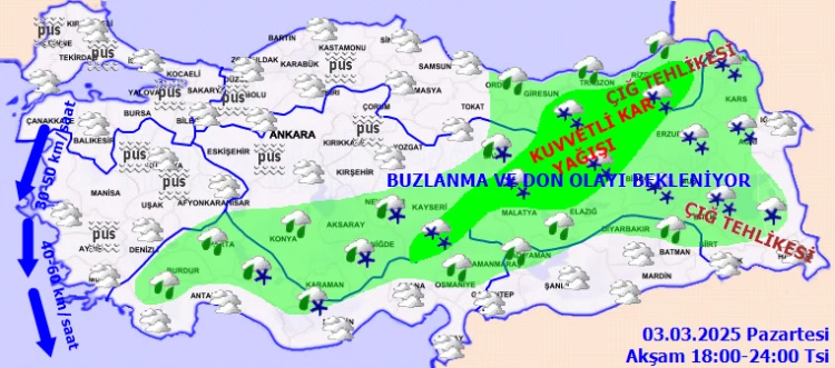 Kar yağışlarının Doğu Karadeniz'in iç kesimleri ile Karaman, Niğde, Kayseri, Sivas, Erzincan, Tunceli ve Bingöl çevrelerinde yer yer kuvvetli olacağı tahmin ediliyor. Yurdun iç ve doğu kesimlerinde buzlanma ve don ile birlikte pus ve yer yer sis bekleniyor.