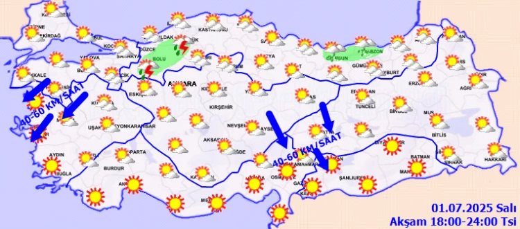 Rüzgarın genellikle kuzey yönlerden hafif, zaman zaman orta kuvvette esmesi beklenirken, Marmara’nın güneybatısı, Kuzey Ege kıyıları, Doğu Anadolu’nun güneybatısı ile Kahramanmaraş ve Adıyaman çevrelerinde rüzgarın hızı 40-60 km/saat arasında olacak şekilde kuvvetli eseceği tahmin ediliyor.