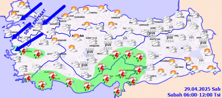 Yağışların; Denizli, Aydın, Kayseri ve Sivas çevreleri ile Burdur’un batı kesimleri, Antalya’nın batısının iç kesimlerinde yer yer kuvvetli olması bekleniyor. Sabah ve gece saatlerinde İç Anadolu'nun güney ve doğusu, Batı Karadeniz'in iç kesimleri, Orta ve Doğu Karadeniz ile Doğu Anadolu'da pus ve yer yer sis hadisesinin görüleceği tahmin ediliyor. Doğu Anadolu'nun güneydoğusu ile Güneydoğu Anadolu’da toz taşınımı bekleniyor.